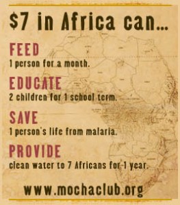 So come one! Join me in giving up two mochas each month for the great need that exists in Africa. I’m supporting Orphan Care + Vulnerable Children projects. (BTW, I’m not alone in this – check out some of the other sponsors.)