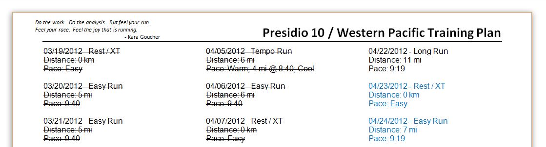 - Current plan: Prep for Brazen Racing’s Western Pacific / bridge for half-marathon program