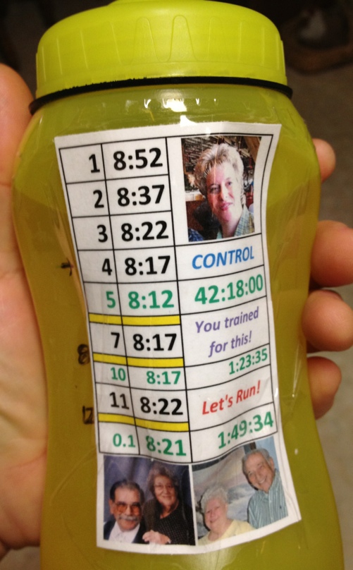 Pacing. I planned my pace goal using the McMillan Pace Calculator and my time from the Presidio 10 Mile. Knowing that the course was flat, I stuck with the goal and didn’t compensate for hills. I then used the Pace Band Calculator at races2remember.com, choosing the “Warm-up Strategy” option. I copied the pacing to a spreadsheet and, as I did for the Presidio, I taped the plan to my water bottle – along with some other encouraging words and images. I tried to stick to the pace, knowing that I’d get tired later in the race; but, as you can see below, I still ended up fast at the beginning, miles 6, 7, & 11 – something to work on. I was fast on mile 13, but that’s OK – it’s the end and I was pumped!