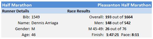 This past Sunday I ran the inaugural Pleasanton Half Marathon – which happened to also be my “inaugural” half marathon as well. When I saw the ad for the race, I thought it would be cool to make it my first. The race benefited the Pleasanton Partnerships in Education (PPIE), a community organization that supports local public schools. They also held a 5k “fund” run that started about 30 minutes after the half marathon – it looked like there were quite a few participants in that race as well. The event is part of the California Running series, which includes two other events: The NORCAL Marathon & Half and the Morgan Hill Marathon & Half.