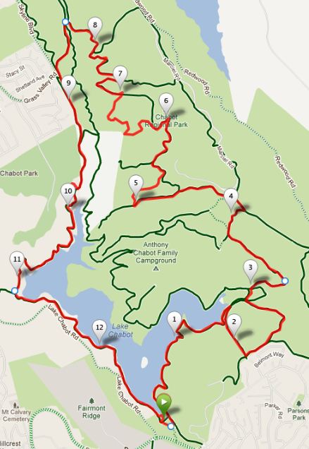 The course was hilly and a mix of paved and dirt trails (30 and 70% respectively) that circled Lake Chabot and Chabot Regional Park. With the rain that we’d had the previous week, it was pretty muddy in sections and there were three trees down across the trail…all of which made for a great trail run that required that you pay attention to the trail. I managed to not slip – and believe me, there was evidence of fellow runners slippin’ and slidin’ in a number of sections.