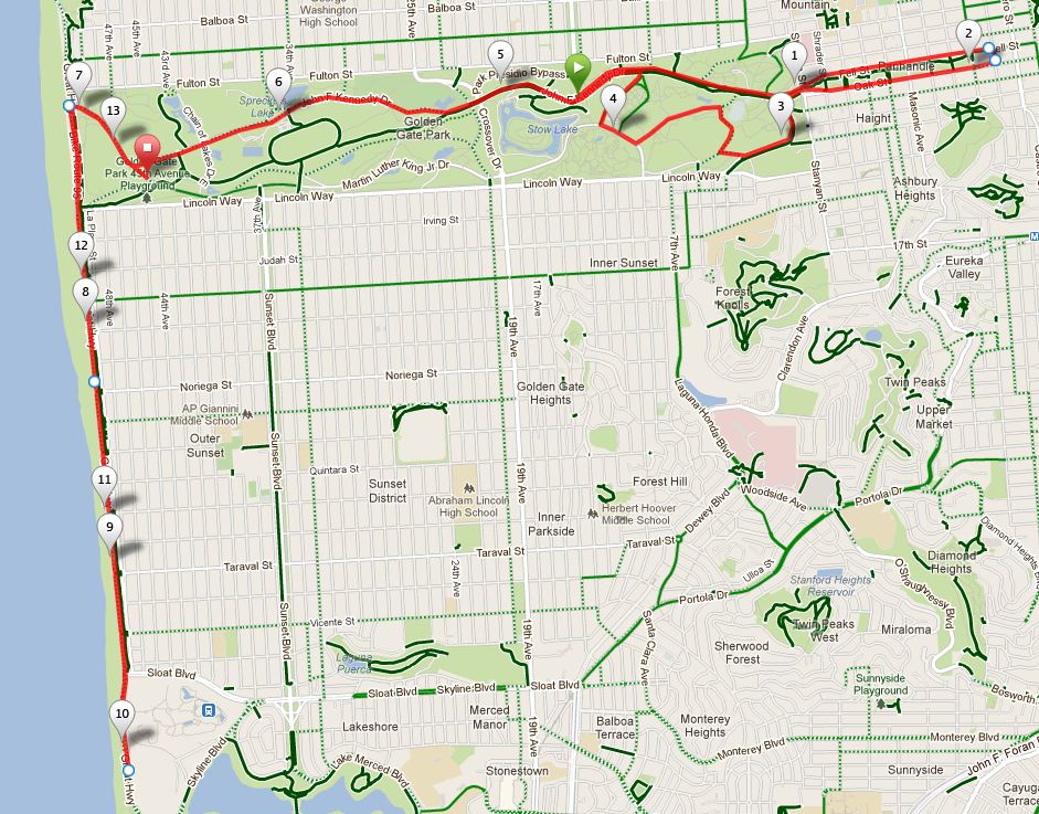The course was a scenic, point-to-point starting in Golden Gate Park near the de Young Museum, out and around the Panhandle, back through the Park, out and back along the Great Highway (coast), and ending just back inside the Park. It was all on pavement and flat, other than a 2 mile section of downhill (~275′ decent.)