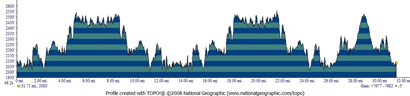 I modified my pre-race carb loading plan slightly for the 31-mile distance (36 hours of >80% carbs and +1200 calories above my normal day) and my changed my pre-race meal from my standard, Sara Lee plain bagel to a stack of McDonald’s hotcakes and some light syrup! I am pretty happy with my nutrition/fueling strategy at this point in my running, having used it on all longer distance runs: half-marathon, marathon, and 50K. I have not bonked yet (knock wood)…though I’m sure it will happen at some point. I’ve gotten tired, but not to the point of what I’ve read “bonking” involves. My tiring has more to do with pacing than not having enough energy or reaching exhaustion. I also recently read about drinking Coke at aid stations on a few blogs. I NEVER drink Coke (I prefer Diet Coke), but tried it at each aid station: it was sweet nectar! It hit the spot and actually tasted pretty good. I’m confident that I won’t start drinking it apart from an endurance run, but it is something I will add to my aid station favs.