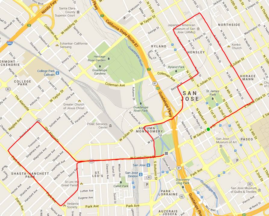 The course started at the intersection of Santa Clara and Market in downtown San Jose and made its way around downtown, out on the Alameda, near the edge of the Rose Garden neighborhood, then back toward downtown, finishing just east of the SAP Center. It’s a flat course, unless one counts the train underpass near the SAP Center.
