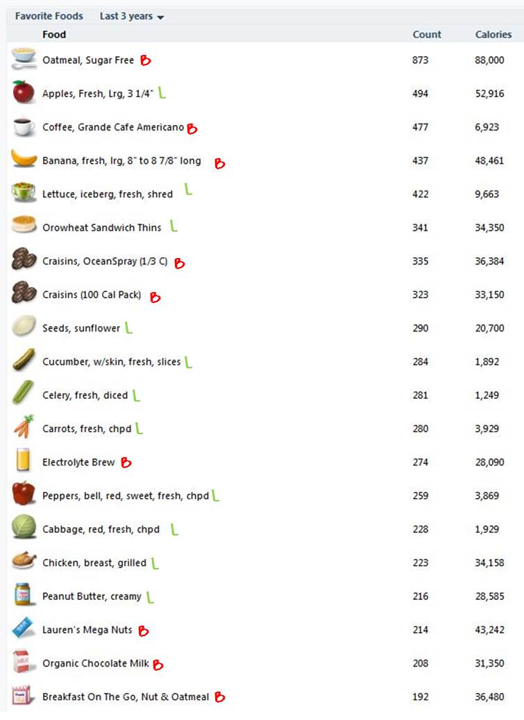 Here’s a look at the top 20 food items for the past three years…OK, 19, since craisins are listed twice. All these are either breakfast or lunch items…